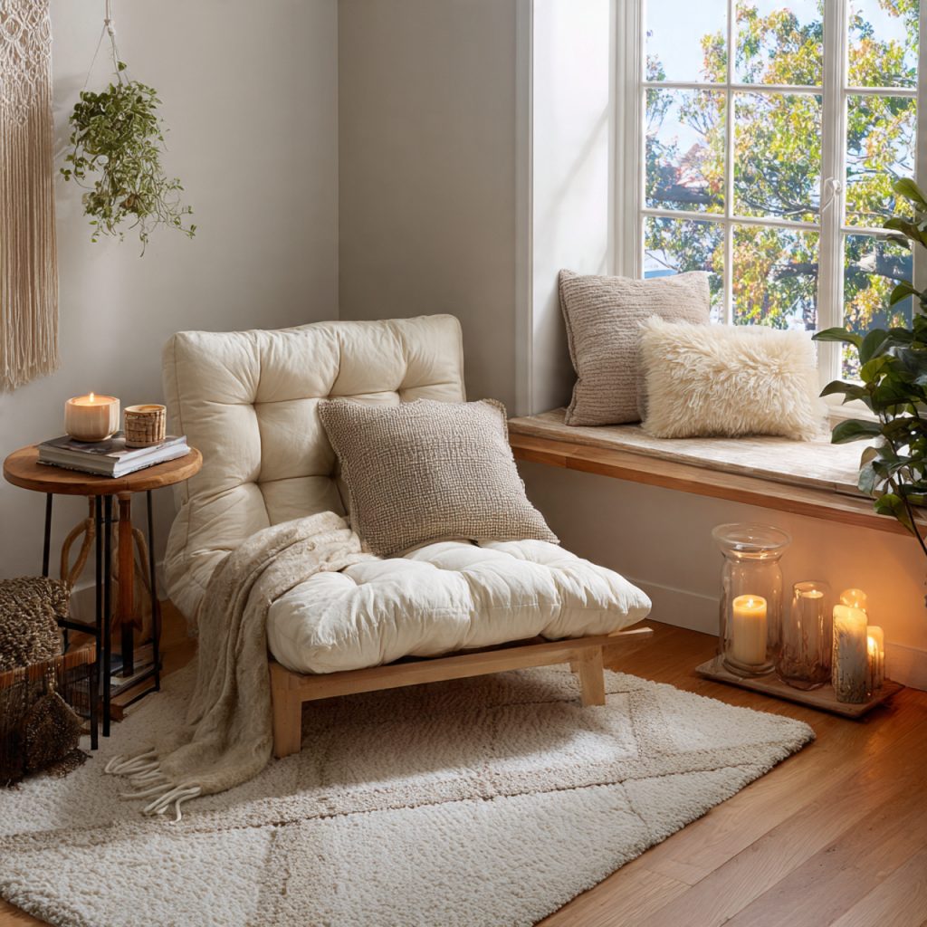 Create a cozy reading or meditation corner with a comfortable chair or floor cushion. Add a soft throw, a small side table, and warm lighting. Incorporate natural elements like a small plant or wooden decor.