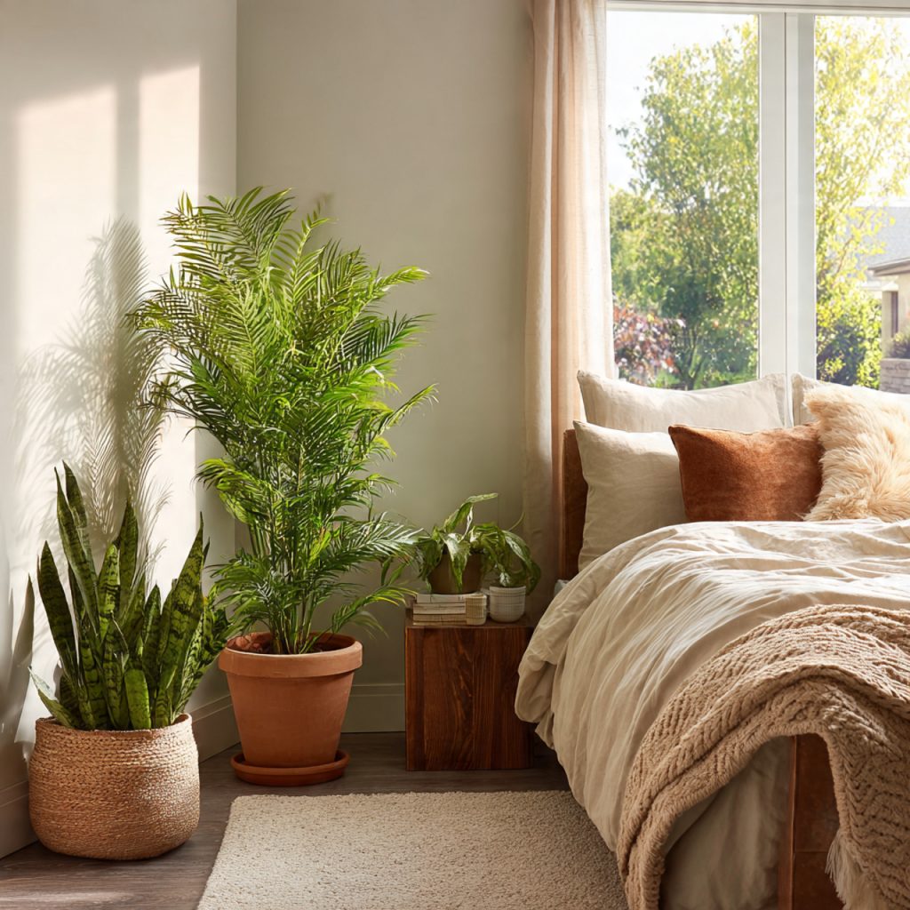 Bring in greenery with potted plants like monstera, snake plant, or pothos. Plants add life, color, and a natural touch to a neutral bedroom. Terracotta or clay pots enhance the earthy aesthetic.