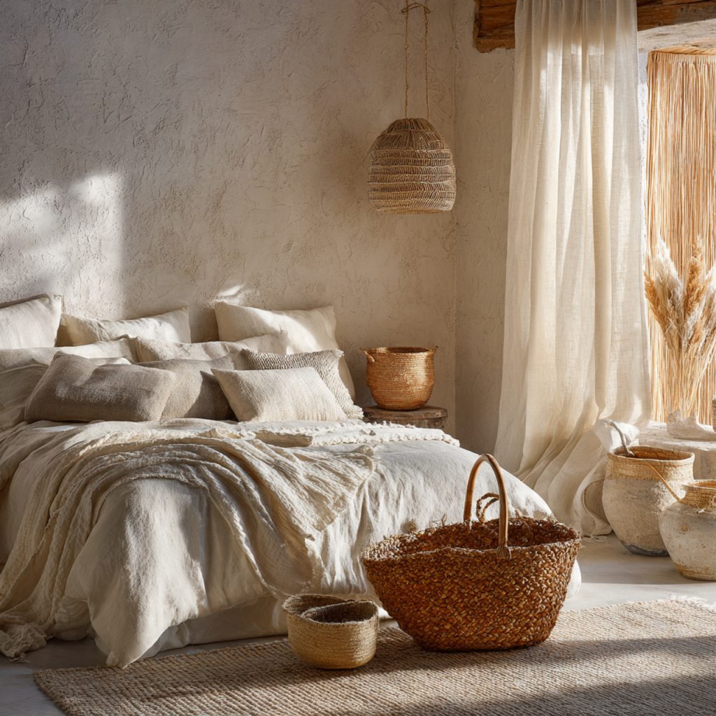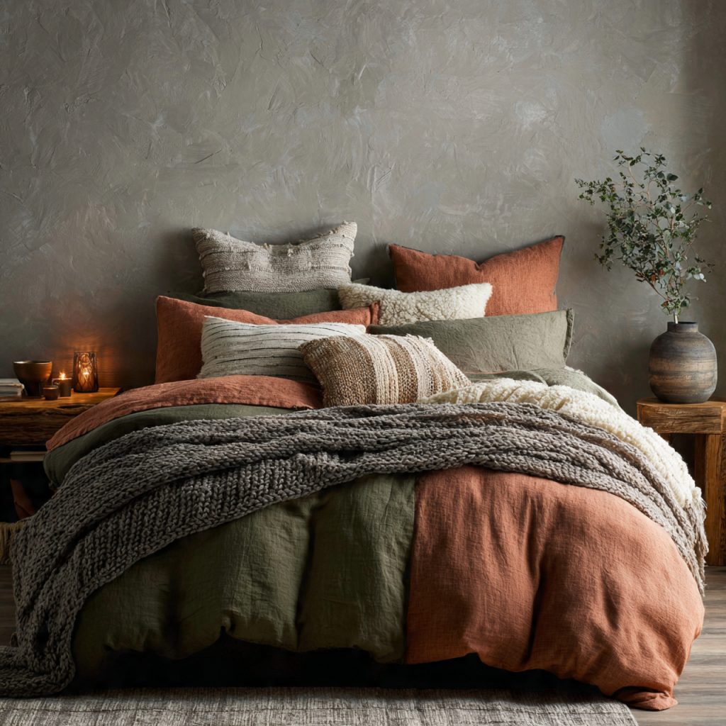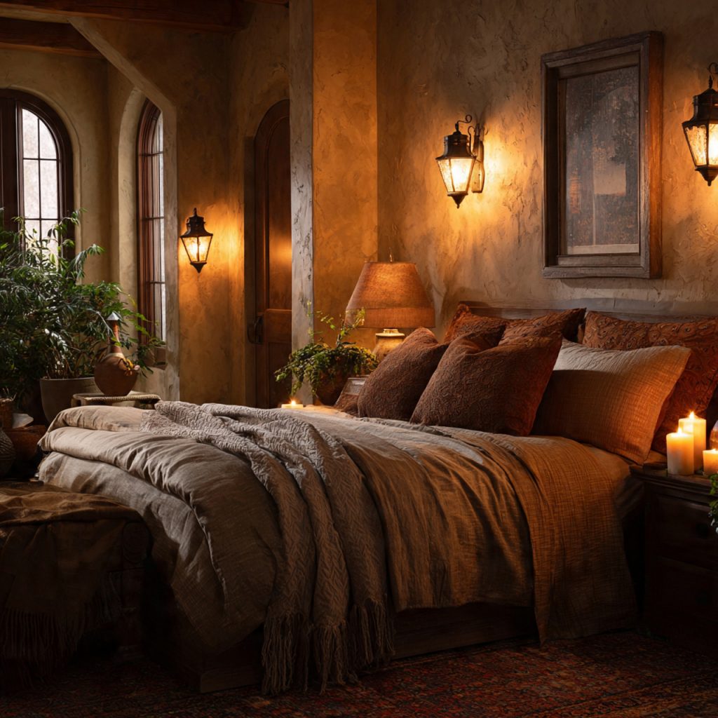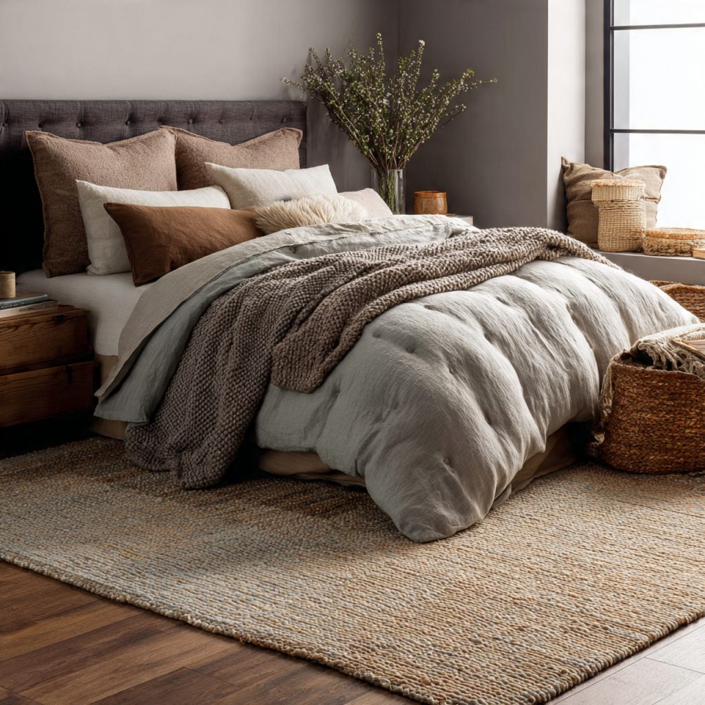 Use layered bedding with earthy tones such as terracotta, olive green, and soft browns. Incorporate plush throws, chunky knit blankets, and textured cushions. Linen, cotton, and wool fabrics work well to add warmth. Layering not only adds comfort but also a visual depth that makes the room feel lived-in.