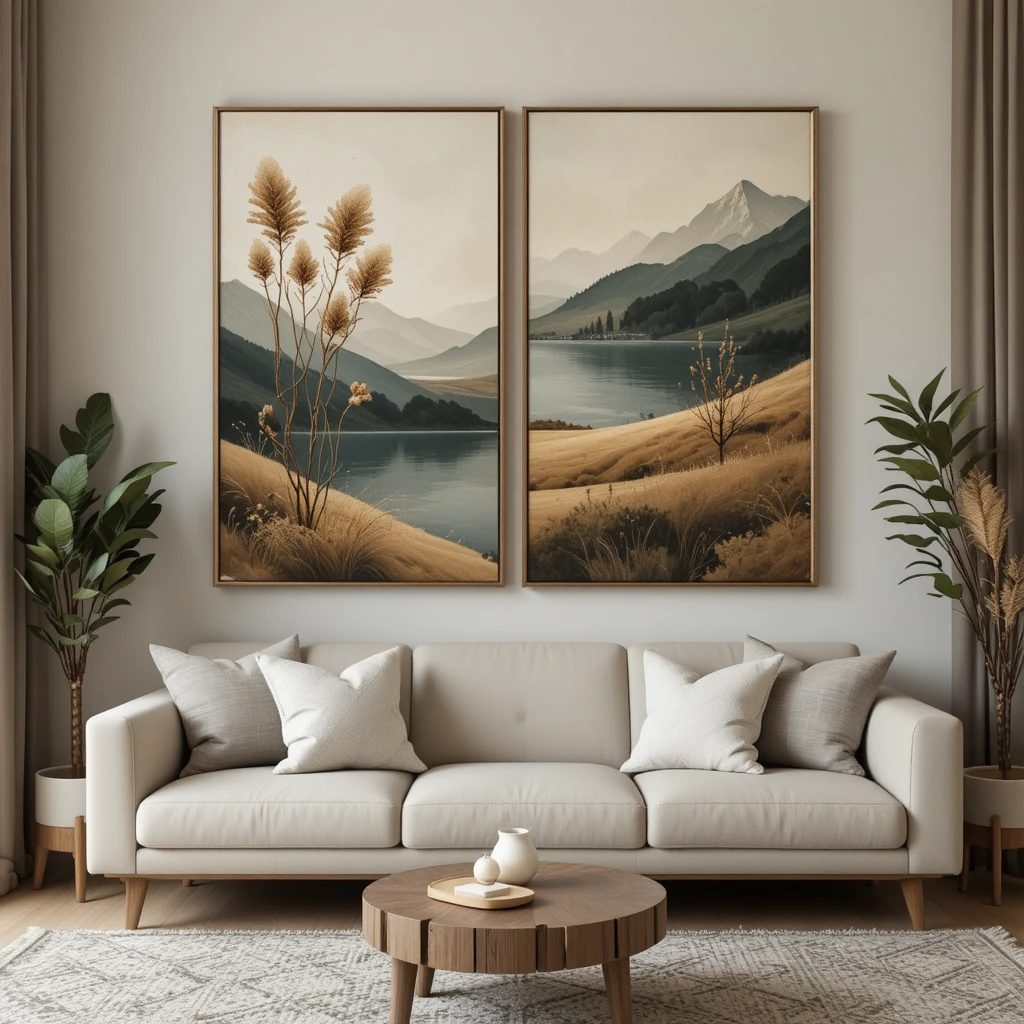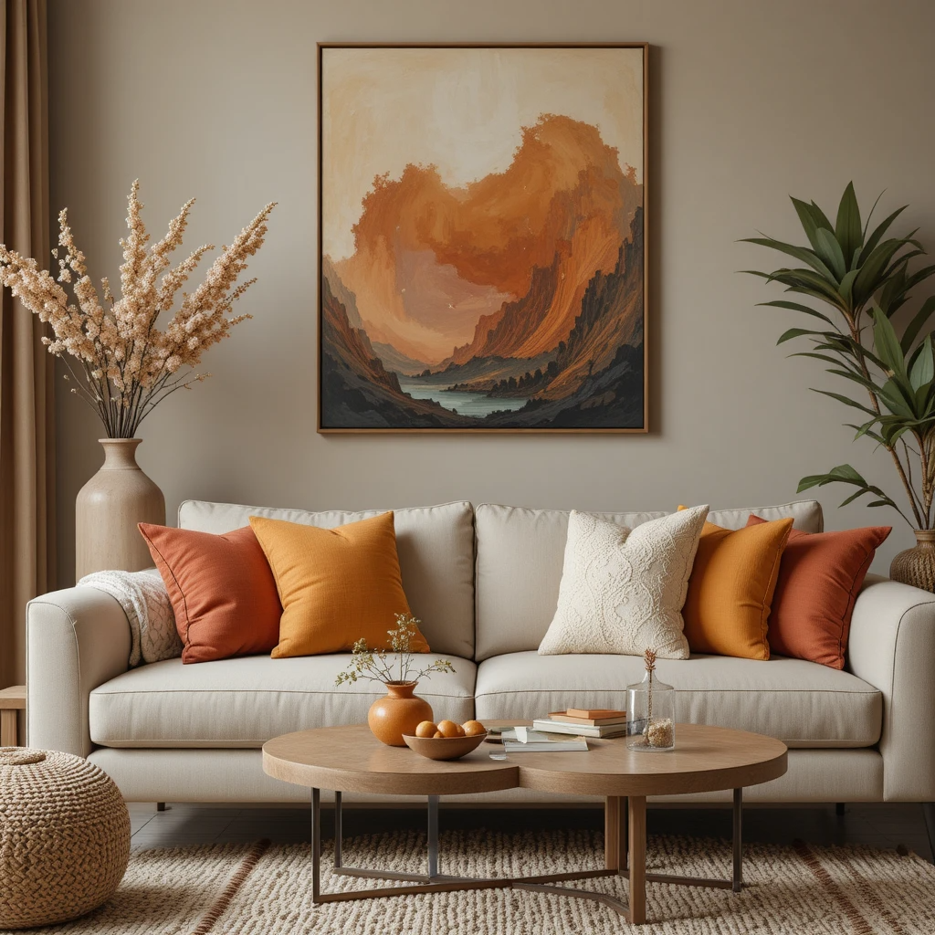 Choose wall art inspired by nature: landscapes, abstract earthy tones, or botanical prints. Large framed pieces or a gallery wall can anchor the room. Stick to warm neutral frames like wood, bronze, or matte black.
