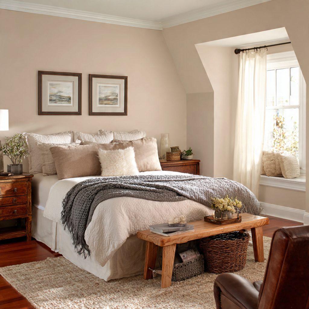 Paint your bedroom walls in warm neutral tones like soft beige, taupe, or creamy sand. These shades create a calming backdrop that makes the space feel cozy. You can also use a subtle textured paint or plaster finish to add depth.
